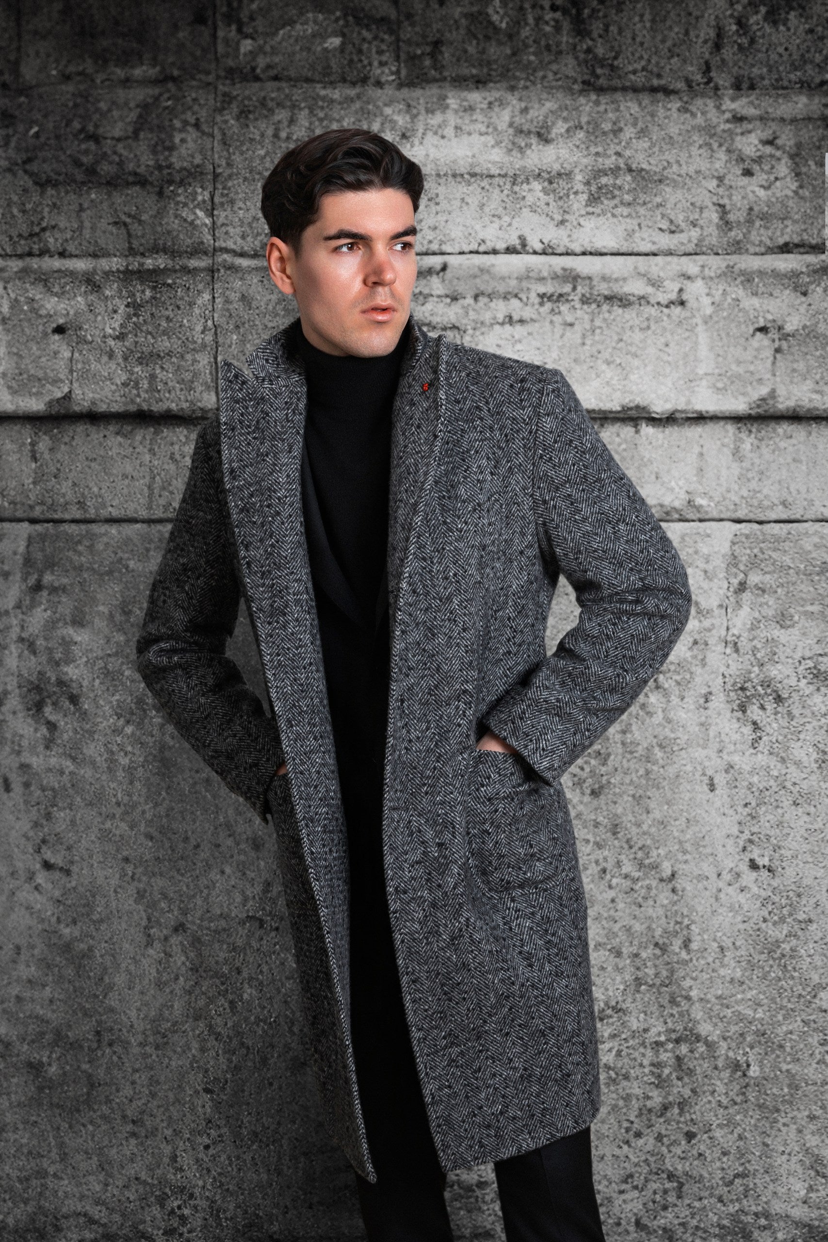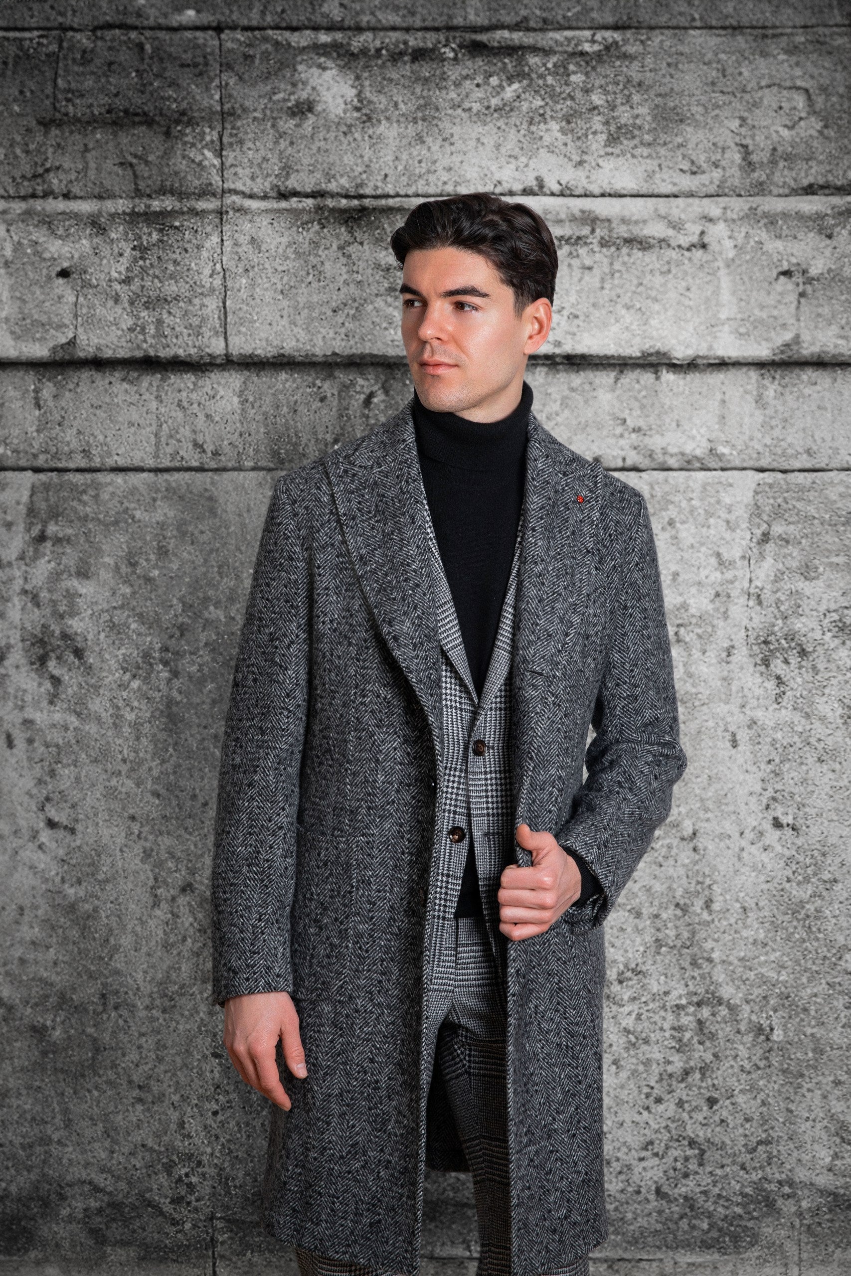 Un pardesiu model clasic dar si cu accente moderne, la un rand de nasturi, necaptusit. Amestecul de 97% lana si 3% poliamida intr-o culoare speciala, pepit de gri cu negru, il face deosebit de versatil, confortabil si placut la purtat.