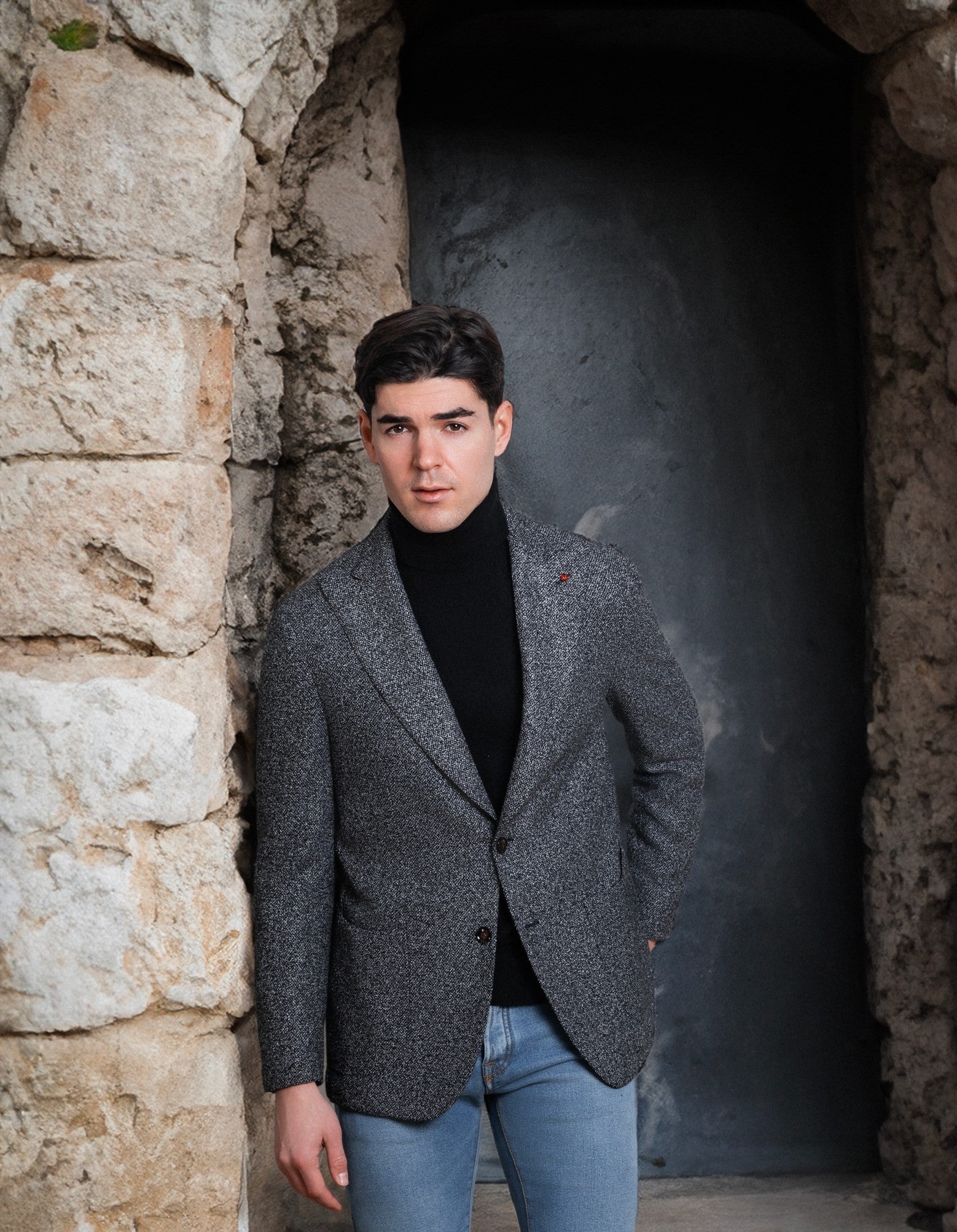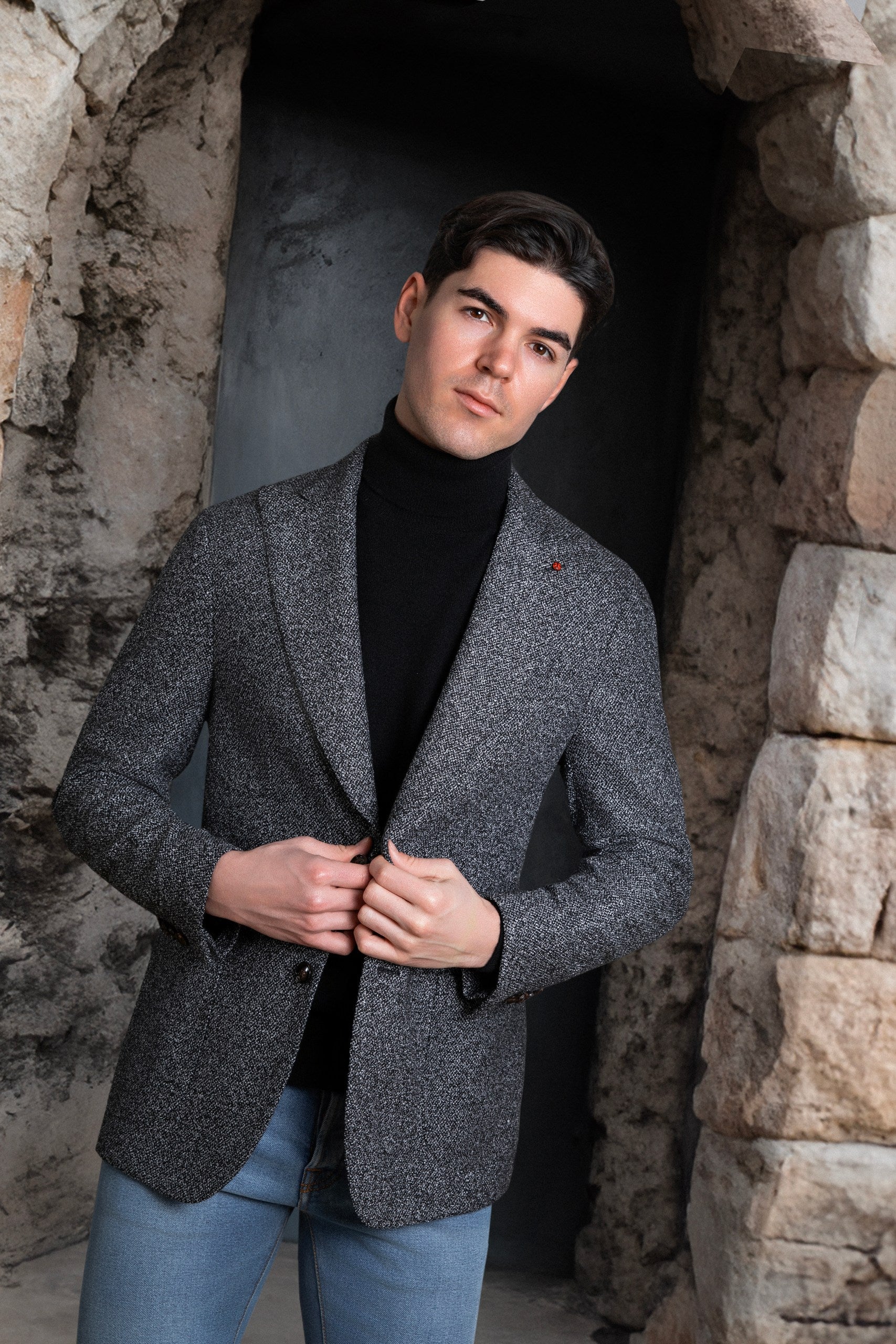 Un sacou casual, model deosebit de versatil si confortabil, din 66% lana / 30% vascoza / 2% poliamida, in culoare melanj (pepit) de gri cu negru.